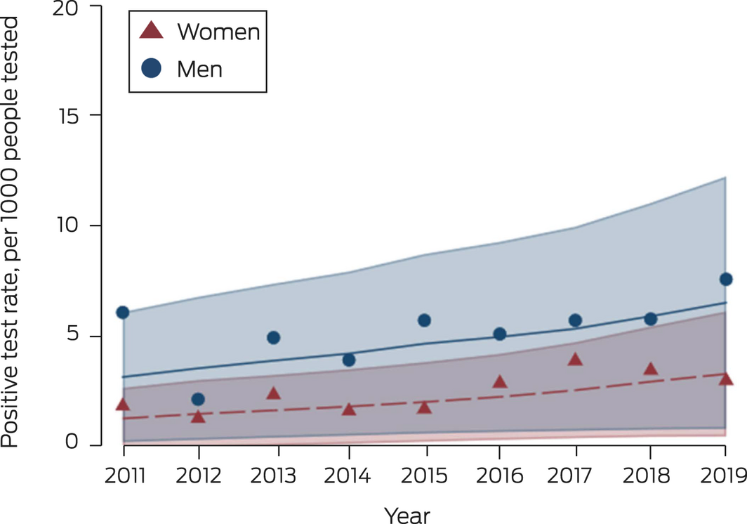 For women, the largest changes in the positive test rate were for those who reported injecting drug use during the past twelve months (from 7.2 [95% CI, 6.9–21] to 28 [95% CI, 3.4–52] per 1000 women tested), Australian‐born women (from 2.3 [95% CI, 0.5–4.2] to 5.9 [95% CI, 3.5–8.3] per 1000 women tested), and Aboriginal and Torres Strait Islander women (from 19 [95% CI, 18–56] to 47 [95% CI, 1–93] per 1000 women tested). For heterosexual men, the largest changes were for those who reported injecting drug use during the past twelve months (from 6.0 [95% CI, 3.6–6.6] to 19 [95% CI, 2.5–41] per 1000 men tested) and Australian‐born men (from 5.4 [95% CI, 2.3–8.5] to 11 [95% CI, 7.7–15] per 1000 men tested) (Supporting Information, figures 1 to 7).
