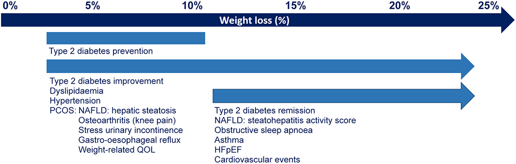 The main purpose of obesity treatment is to improve health and wellbeing. All medications are indicated in conjunction with lifestyle interventions, as optimising diet quality, reducing energy intake and increasing energy expenditure have their own health benefits, as well as improving the effectiveness of treatment with obesity medications.74,75 As an example, the use of liraglutide in combination with physical activity over 12 months resulted in an additional mean weight loss of 2.7 kg and reduction in body fat of 1.7% compared with liraglutide alone.75