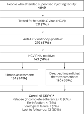Conclusions: People who attend supervised injecting facilities can be tested and treated for hepatitis C on site. Models that provide streamlined, convenient hepatitis C care promote engagement with treatment in a group in which the prevalence of hepatitis C is high.