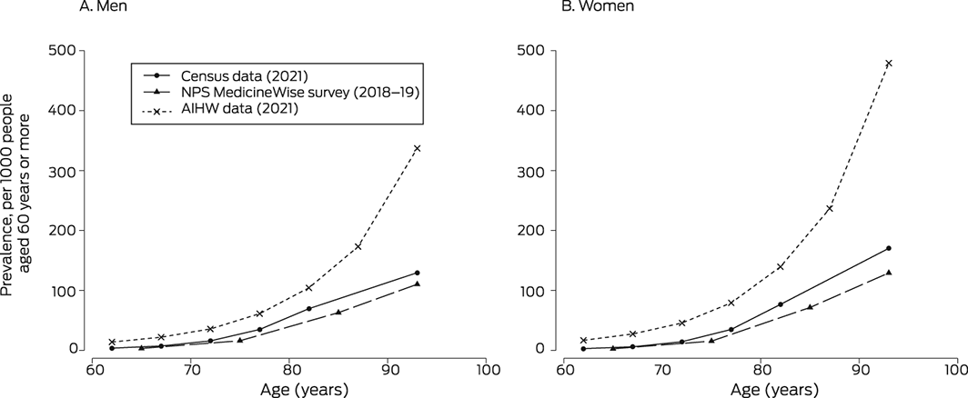 The estimated prevalence of dementia among people aged 60 years or more based on 2021 census1 or 2018–19 NPS MedicineWise data2 was lower for men and women of all ages than that based on 2021 AIHW data3 (Box). The estimated age‐ and sex‐standardised prevalence was 31.4 per 1000 people (2021 census), 21.4 per 1000 people (2018–19 NPS MedicineWise survey), and 65.9 per 1000 people (2021 AIHW data). The estimated number of people aged 60 years or more living with dementia were 181 580 (2021 census), 123 818 (2018–19 NPS MedicineWise), and 380 768 (2021 AIHW). In 2022, NATSEM estimated that 487 500 people (all ages) had dementia.5