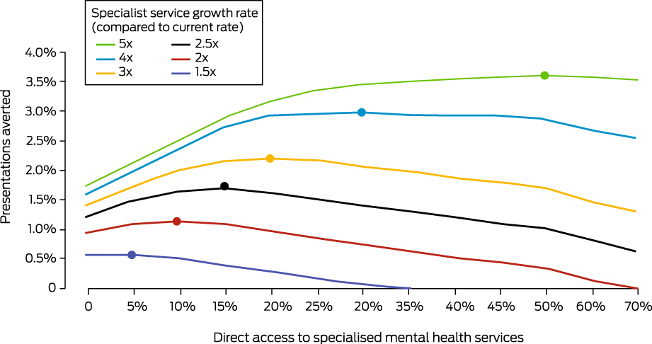 Results: Direct access (for 10–50% of people requiring specialist mental health care) would lead to increases in the numbers of mental health‐related emergency department presentations (0.33–1.68% of baseline), hospitalisations with self‐harm (0.16–0.77%), and deaths by suicide (0.19–0.90%), as waiting times for consultations would increase, leading to disengagement and consequently to increases in adverse outcomes. Increasing the annual rate of growth of mental health service capacity (two‐ to fivefold) would reduce the frequency of all three outcomes; combining direct access to a proportion of services with increased growth in capacity achieved substantially greater gains than an increase in service capacity alone. A fivefold increase in the annual service growth rate would increase capacity by 71.6% by the end of 2028, compared with current projections; combined with direct access to 50% of mental health consultations, 26 616 emergency department presentations (3.6%), 1199 hospitalisations following self‐harm (1.9%), and 158 deaths by suicide (2.1%) could be averted.
