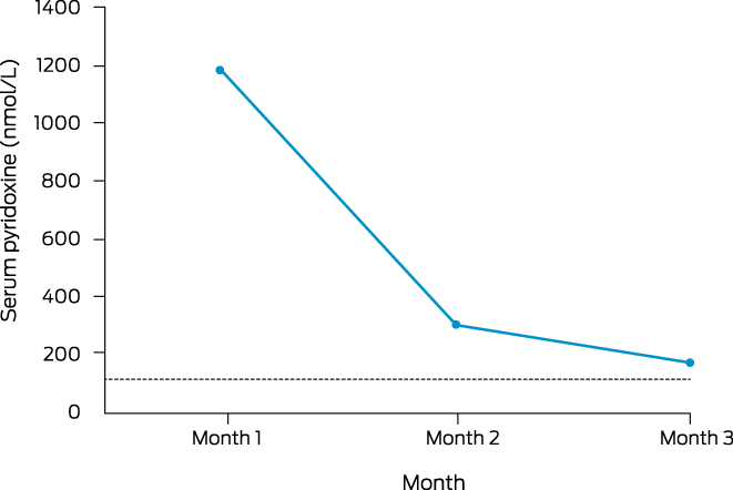 On further discussion about causes of fasciculations and neuropathic symptoms, the patient advised he was taking vitamin supplements, containing a total B6 amount of 95 mg daily. As a consequence, serum B6 level was measured and returned a markedly elevated value at 1179 nmol/mL (reference interval, 35–110 nmol/mL). All supplements were ceased, with precipitous decline of serum pyridoxine (Box 2) associated with a remarkable improvement in symptoms.