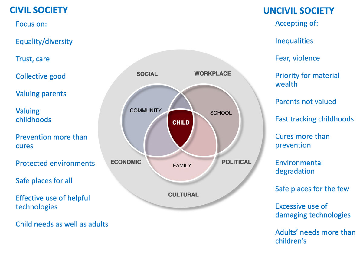 Policies for children and young people often focus on their closest environments — family, school and community — and these are key to ensuring children can thrive. But the effects of policies within a wider circle of environmental influences — workplaces, societal, economic, political and cultural — also have an impact on their lives (Box 1).18,19 As outlined by Stanley and colleagues19 almost two decades ago, these influences are outside the control of families and schools, yet they can enable or disable healthy futures by creating a civil or uncivil society (Box 1). A key example has been our failure to prioritise preventive health spending, which comprised a mere 2% of health expenditure in 2019 and saw Australia rank 30 out of 40 on the Organisation for Economic Co‐operation and Development (OECD) league table of countries.20