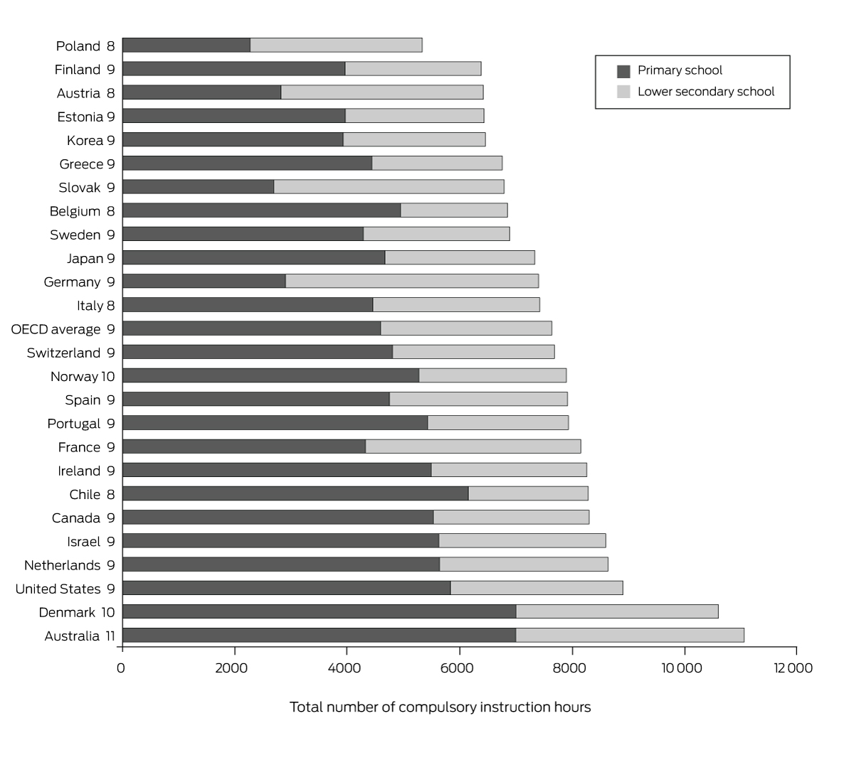 Another difference between Australian schools and those of the OECD countries is that Australian children spend more time in school receiving compulsory instruction than their peers in other OECD countries.8 In OECD countries, on average, students have 4600 hours of primary education and 3000 hours of lower secondary education. Australian children have about 11 000 hours of primary and lower secondary education in total, as shown in Box 1. This is considerably more than in OECD countries on average, and yet these long hours of formal instruction do not turn into high quality learning outcomes or positive wellbeing as measured by current student assessments and health surveys.