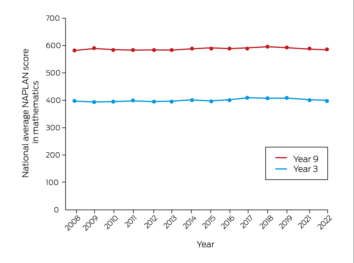 Box 2 – Australian students’ national average achievements in mathematics in Year 3 and Year 9, 2008–2022*
