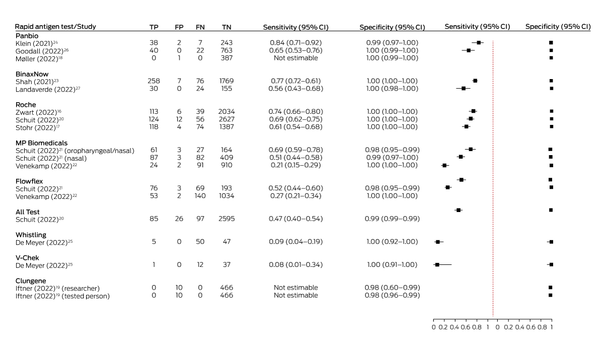 The principal diagnostic accuracy measure for this study was sensitivity per person. We calculated sensitivity and specificity for each study from the reported numbers of true positive, false positive, false negative, and true negative test results to check the sensitivity and specificity reported by the study authors. We then compared the publication values with those reported by the respective manufacturers and published on the TGA website.