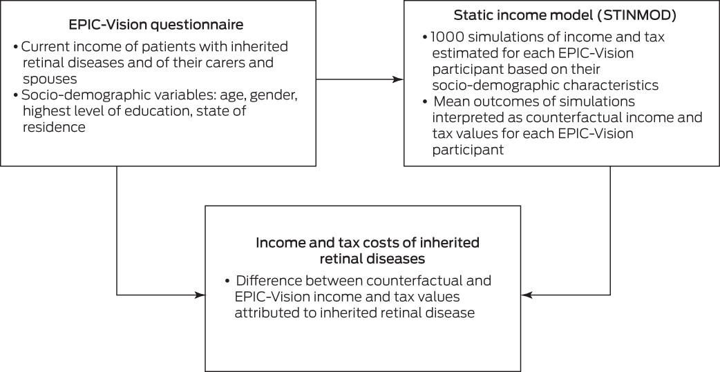 We estimated the income and tax effects of IRDs in a static income model (STINMOD) based on a representative sample of people and households in Australia (Box 1). People with IRDs and their carers and partners were matched in STINMOD with respect to age, gender, and highest level of education, and 1000 simulations run for each person. The mean outcomes were then used as the counterfactuals for each participant (ie, the estimated value if they did not have an IRD), and the effect of the IRD defined as the difference between the simulation outcomes and EPIC‐Vision data for the participant. STINMOD data reflect income and tax levels at the end of 2019.18