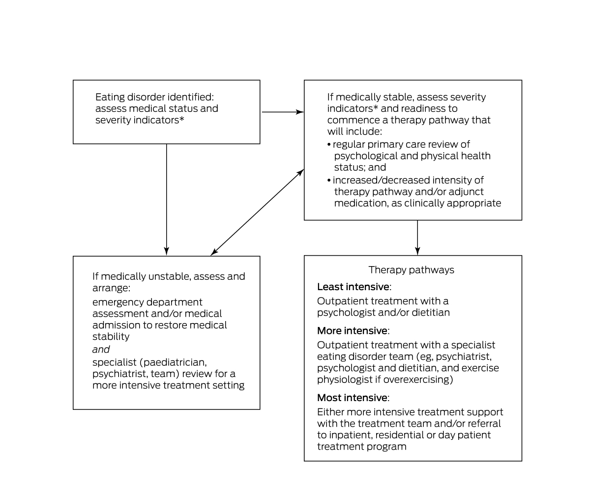 This narrative review summarises recent developments in the identification and management of eating disorders and the gaps that persist in optimal management for eating disorders. We sourced evidence from contemporary international and national evidence‐based clinical practice guidelines3,11,12,13,14,15,16 along with recent systematic reviews and meta‐analyses4,5,8,17,18,19,20,21,22,23,24,25,26,27,28,29 known to the authors and/or identified through a PubMed database search. It was not possible to cite all primary publications on all topics; thus, individual research articles or other publications were selected as examples that reflect the body of literature.