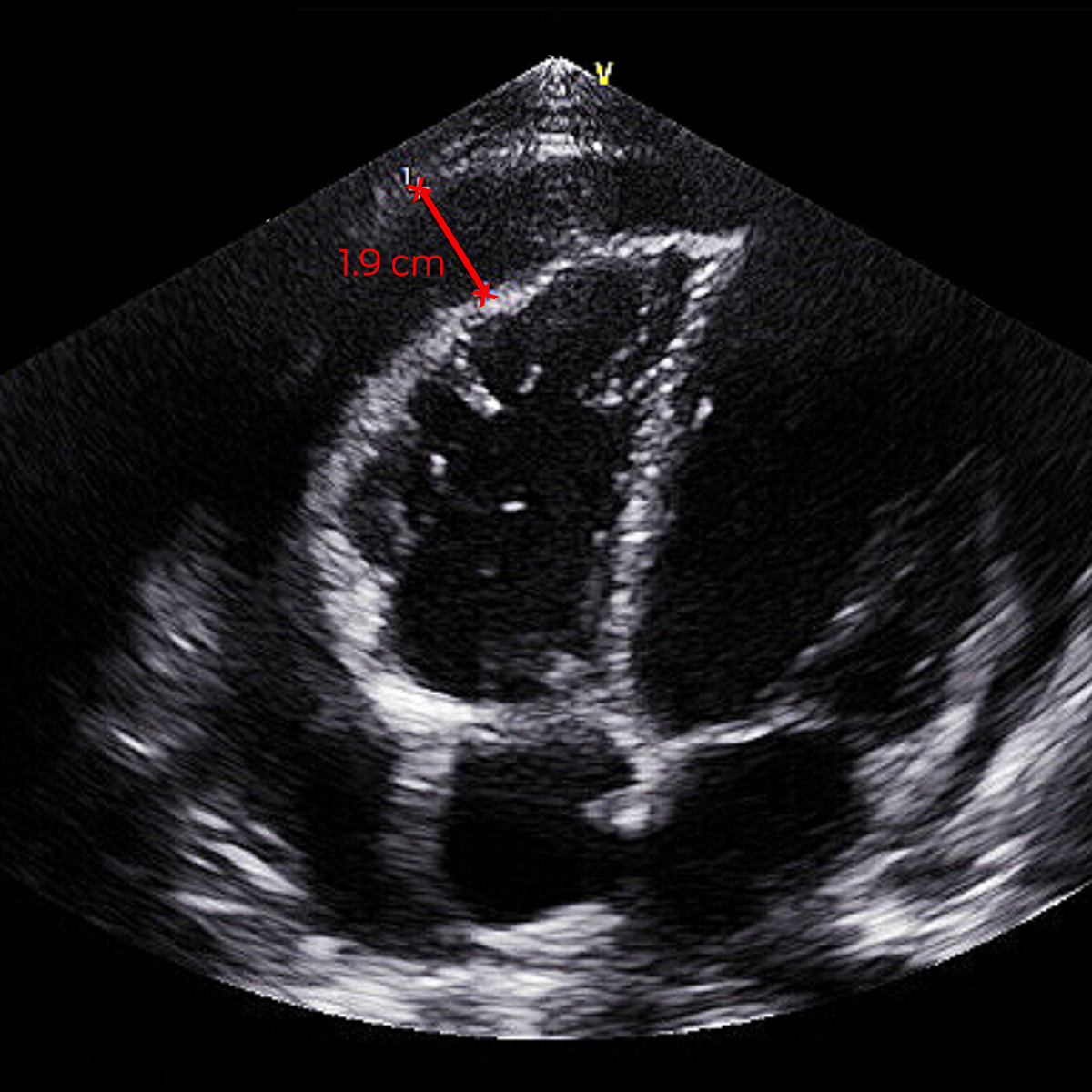 Box 1 – Transthoracic echocardiogram off‐axis four chamber view with pericardial effusion measuring 1.9 cm