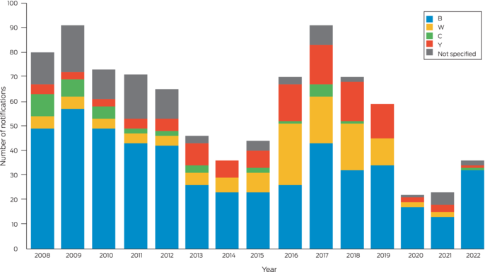 Box 2 – Invasive meningococcal disease notifications in New South Wales residents, by year of onset and serotype (2008–2022)5