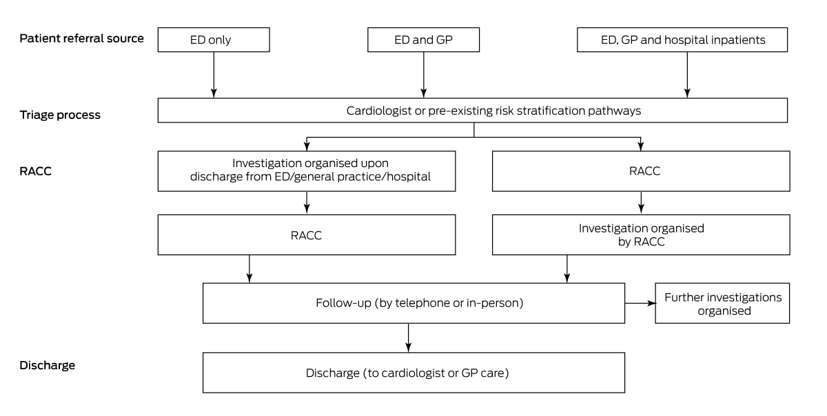 Several RACC models exist in Australia and New Zealand (Box 2). All models in the published literature are run and supervised by cardiologists, with other additional staff including cardiology registrars,22 registrars in conjunction with clinical nurse specialists,6 a predominantly nurse‐led clinic,21 and larger clinics with registrars, junior medical officers, nursing and administrative support.2 One study explored RACCs via telehealth.18 Most RACCs reviewed patients who were referred for evaluation of chest pain, but two clinics also received referrals for investigation of dyspnoea, syncope and arrhythmia.13,20