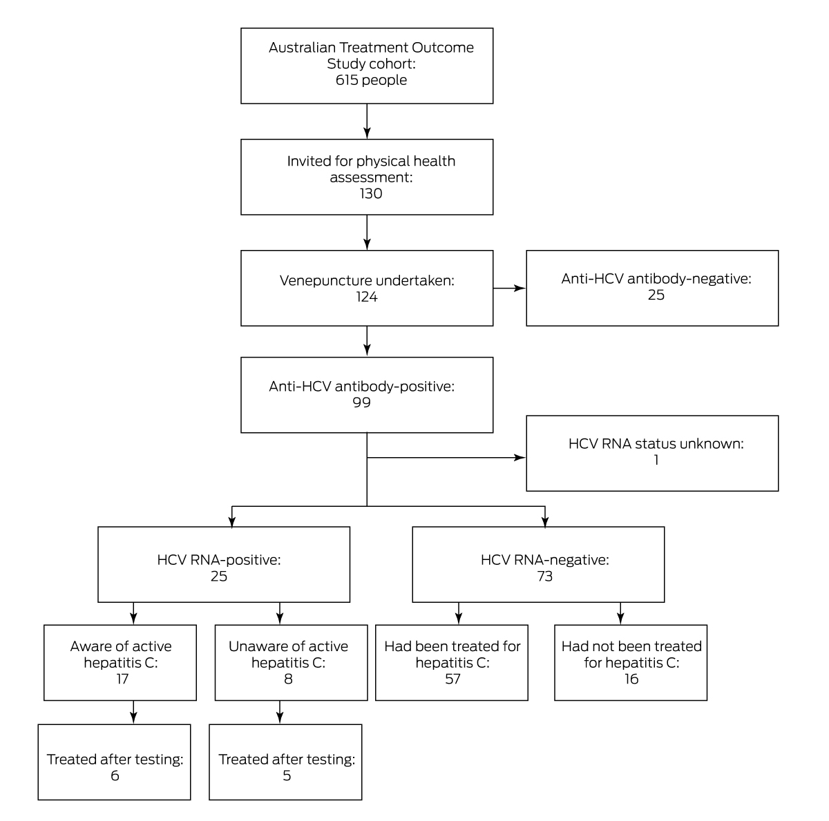 Of the 130 invited ATOS participants who consented to HCV testing (95%), blood was successfully collected from 124. A total of 99 people had been exposed to HCV (80%): 25 had active hepatitis (none of whom had sought treatment), 73 had infections that had since resolved, and the HCV RNA status of one participant could not be determined. As 57 of participants with past infections had been treated (78%), 57 of the 99 people exposed to HCV had been treated (58%); past infections in sixteen people had apparently resolved without treatment (Box 1, Box 2).