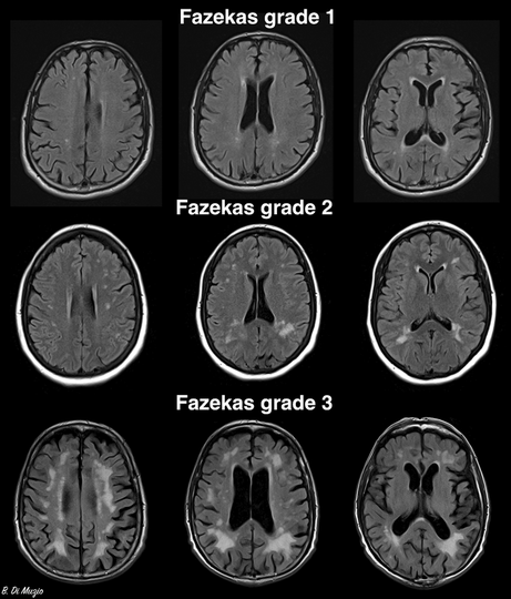 * The Fazekas grading system divides white matter hyperintensities into deep and periventricular lesions, and grades each region separately: deep: 0 = absent, 1 = punctate foci, 2 = early confluence, 3 = large areas of confluence; periventricular: 0 = absent, 1 = thin lining or “caps” on lateral ventricles, 2 = smooth halo around lateral ventricles, 3 = irregular periventricular signal extending to the deep white matter.9The top row of the figure demonstrates punctate foci and caps on the lateral ventricles; the middle row demonstrates early confluence and smooth halo around lateral ventricles; and the bottom row demonstrates large areas of confluence in the deep white matter and irregular periventricular signal extending to the deep white matter.Source: Image reproduced from Di Muzio B. Fazekas scale for white matter lesions. Case study. Radiopaedia.org doi: . https://creativecommons.org/licenses/by‐nc‐sa/3.0/legalcode (viewed July 2023).