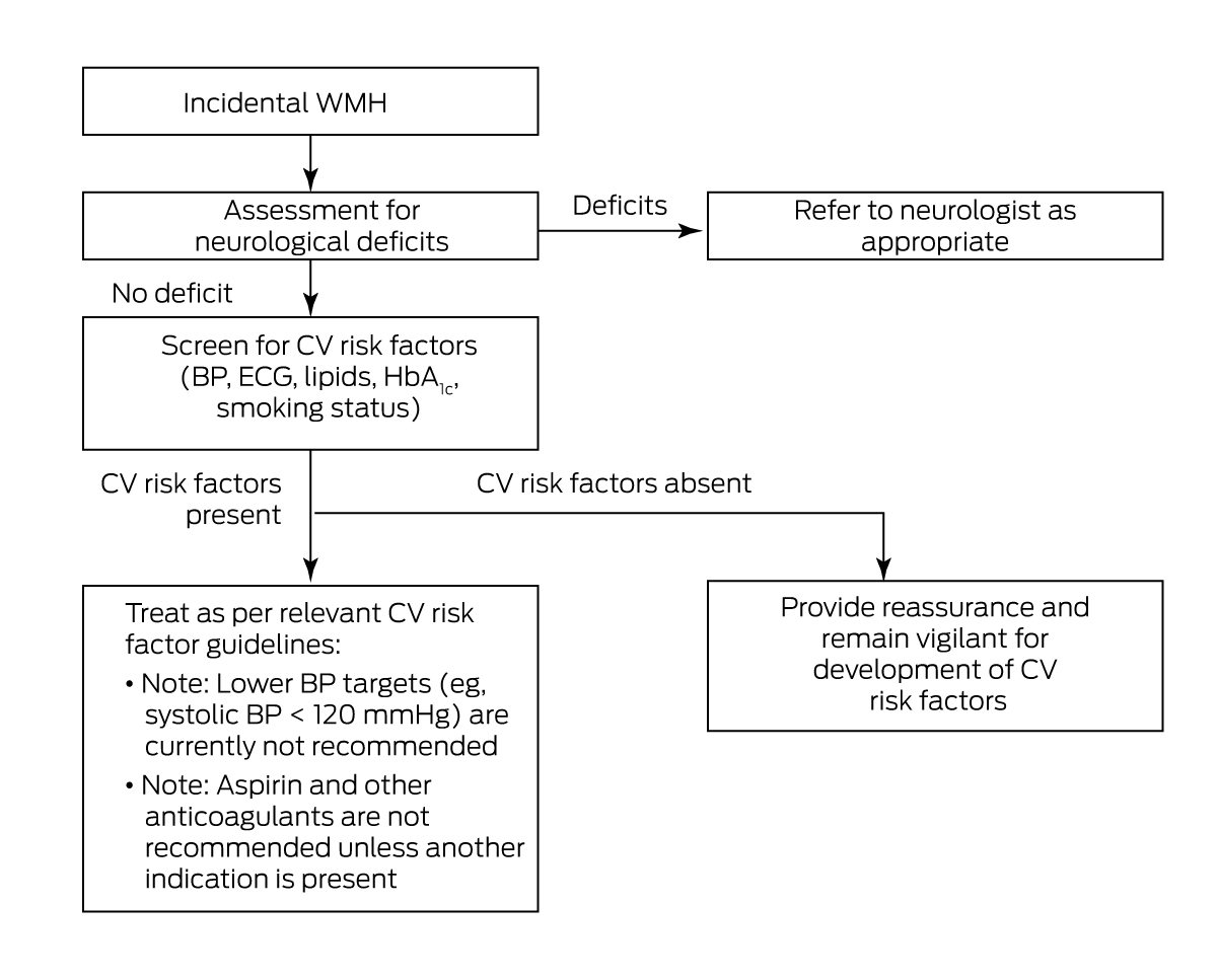 Changes to management as a result of this consensus statement: A brain health opportunity. We consider the discovery of incidental WMH on brain imaging to represent an opportunity to investigate for common cardiovascular risk factors and to optimise brain health. This can be commenced and monitored by the general practitioner or physician without delay in waiting for an outpatient neurology review.