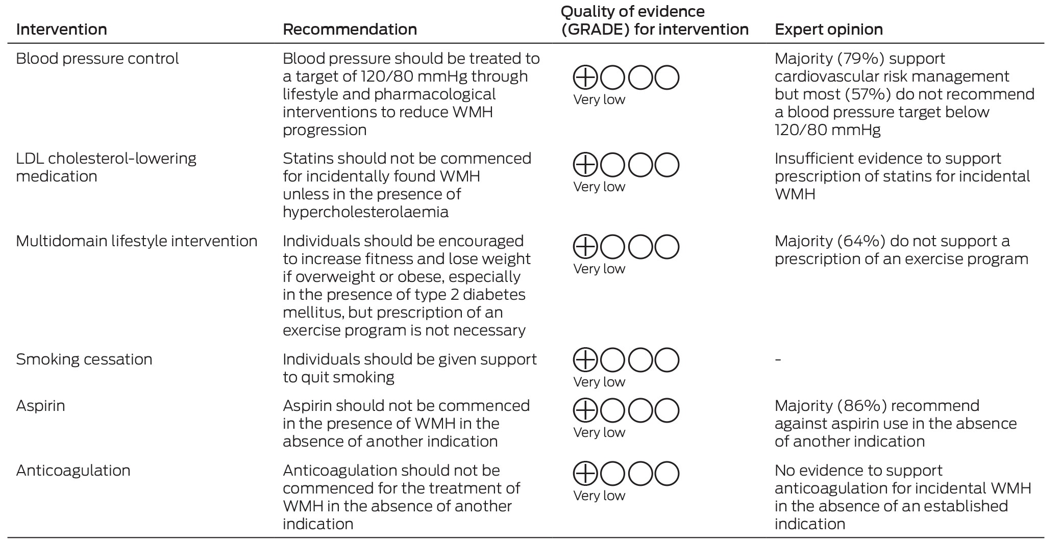 Box 2 – Summary of recommendations, quality of evidence, and expert opinion for interventions for incidental white matter hyperintensities (WMH)