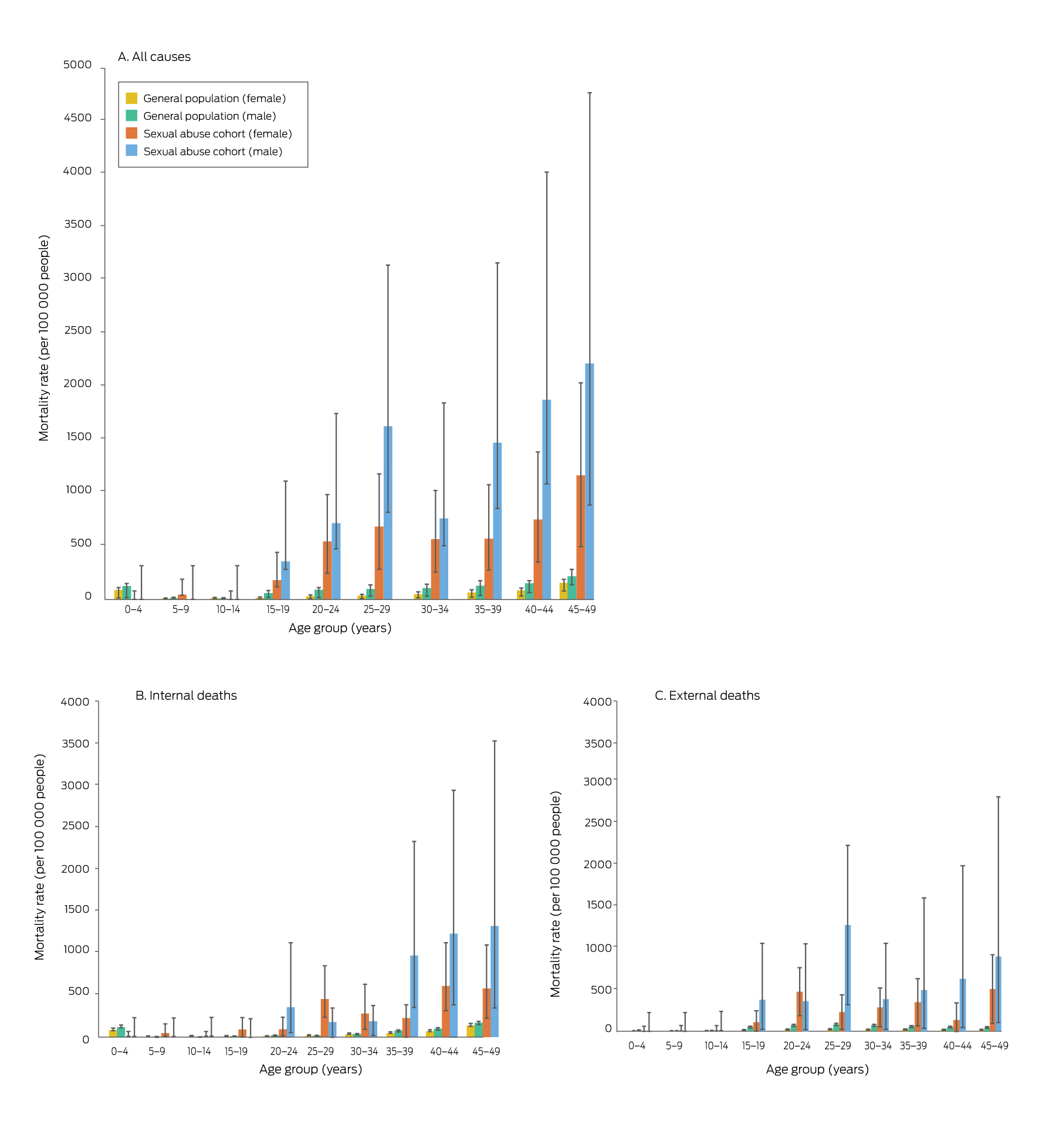 Results: We included 115 deaths of people under 50 years of age in our analysis (4.2% of people sexually abused as children; 79 women, 36 men); 56 deaths were attributed to external, 56 to internal causes (cause of death information missing in three cases). In each age group from 15–19 years, the mortality rates for people sexually abused as children were higher than for the general population; age‐ and sex‐standardised all‐cause mortality ratios were highest for people aged 25–29 years (men: 16.5; 95% confidence interval [CI], 11.0–22.0; women: 19.2; 95% CI, 14.3–24.2). The age‐ and sex‐adjusted mortality rate for people sexually abused as children was higher than in the general population for all‐cause (IRR, 8.25; 95% CI, 5.92–11.5), internal cause (IRR, 5.92; 95% CI, 3.89–9.01), and external cause deaths (IRR, 12.6; 95% CI, 9.61–16.6); the differences in external cause mortality were greater for people who had experienced penetrative (IRR, 14.9; 95% CI, 10.9–20.5) than for those who had experienced non‐penetrative sexual abuse as children (IRR, 8.92; 95% CI, 5.35–14.9).