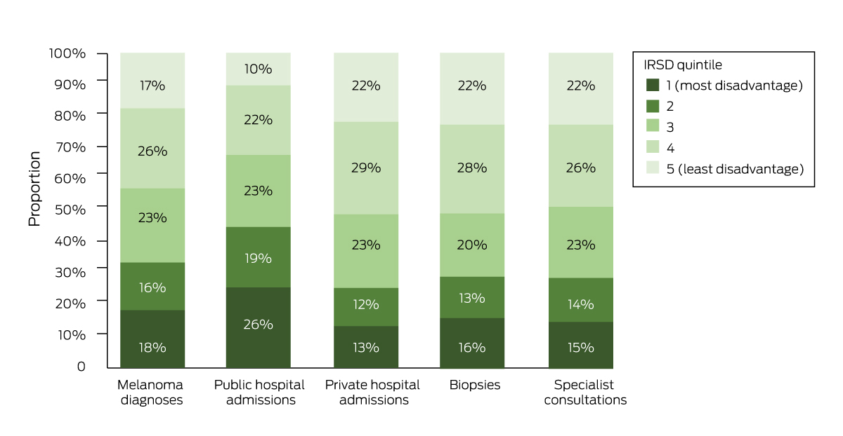 Australia has a mixed health care system in which services are provided in both the private and public sectors.24 One potential consequence of people from more advantaged areas more frequently using private hospitals and specialists is that the public system may have greater capacity to serve those in more disadvantaged areas. Providing skin cancer services of equivalent standard across a decentralised population is logistically difficult. Optimising service delivery to ensure maximal health benefits for everyone should remain the goal, using frameworks for reducing inequity in health care, such as the Australian Cancer Plan.8