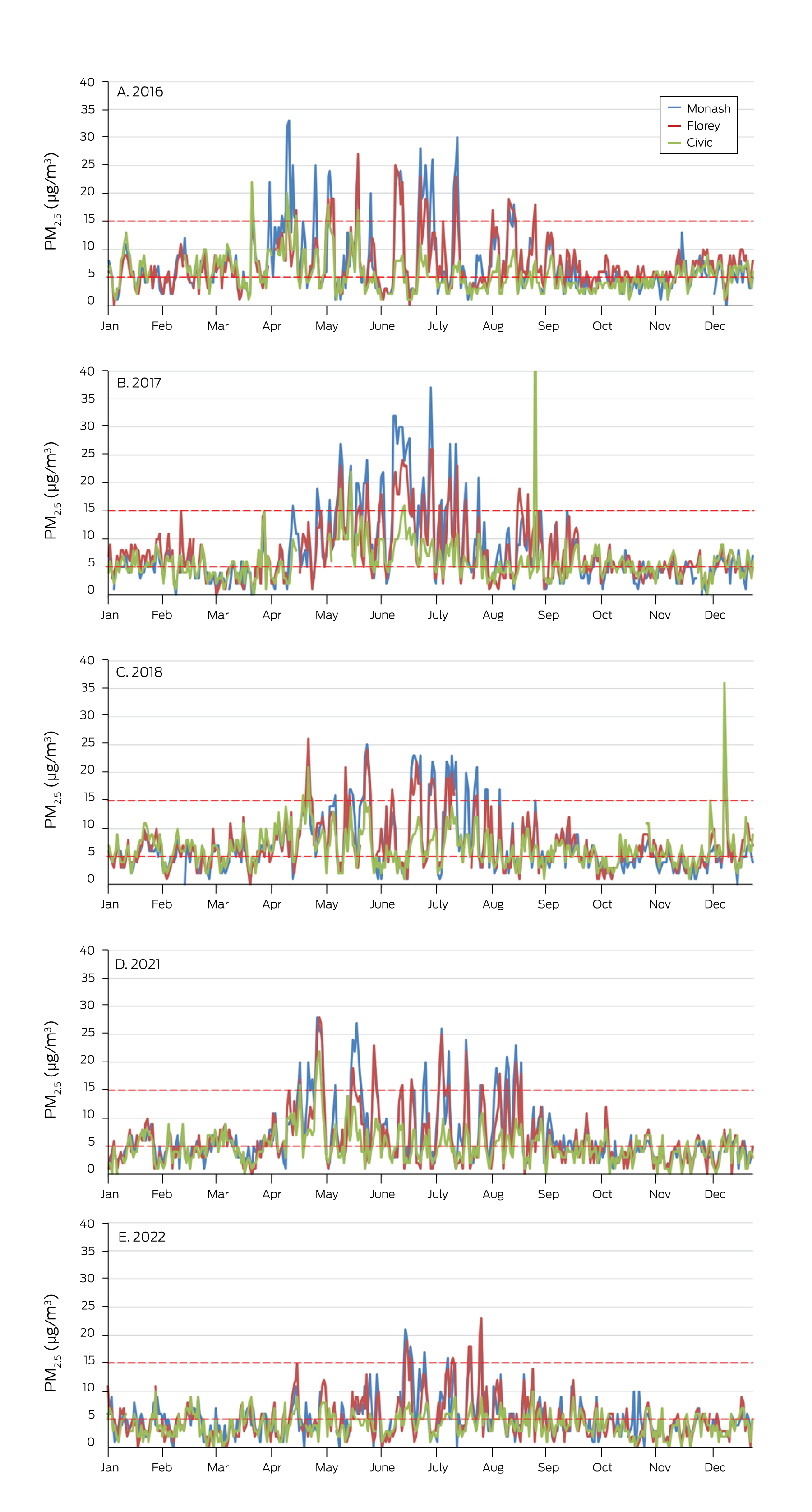 We assessed PM2.5 exposure for the calendar years 2016, 2017, 2018, 2021, and 2022; we excluded 2019 and 2020 because of the influence of the 2019–20 bushfires (“Black Summer”)20 on ambient PM2.5 levels in the ACT. Based on the annual and diurnal patterns of ambient PM2.5 levels in the ACT (Box 2) and responses to a survey on the use of wood heaters,22 we defined 1 April – 30 September as the wood heater season. We calculated the mean PM2.5 concentrations at the three air quality monitoring sites (overall and by site) for the wood heater season and for the remainder of each calendar year. Three years (2017, 2018, 2021) were relatively cold during the wood heater season (and ambient PM2.5 levels higher); two years (2016, 2022) were milder during this period (Supporting Information, figure 1).