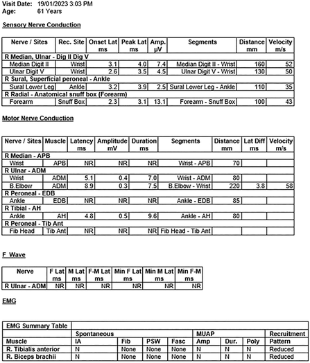 ADM = abductor digiti minimi; AH = abductor halluces; Amp. = amplitude; APB = abductor pollicus brevis; Diff = difference; Dig. = digit; Dur. = duration; EDB = extensor digitorum brevis; EMG = electromyogram; F = F wave; F‐M = F wave minimum; Fasc = fasciculations; IA = insertional activity; Lat. = latency; Min = minimum; MUAP = motor unit action potential; N = normal; NR = not recordable; Poly = polyphasia; PSW = positive sharp waves; R = recorded site; Tib Ant = tibialis anterior muscle.