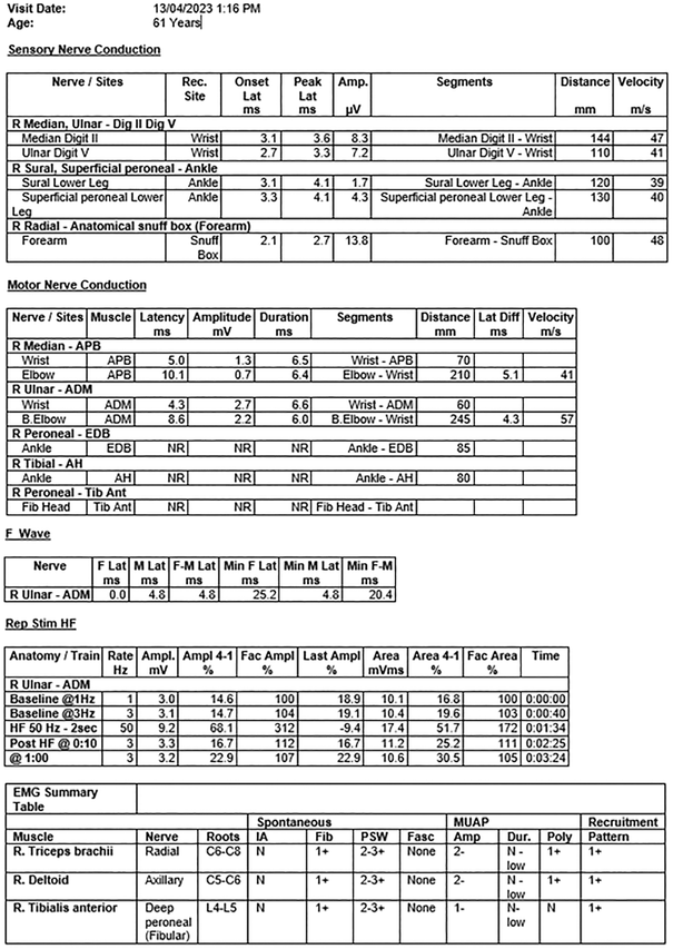 ADM = abductor digiti minimi; AH = abductor halluces; Amp. = amplitude; APB = abductor pollicus brevis; Diff = difference; Dig. = digit; EDB = extensor digitorum brevis; EMG = electromyogram; F = F wave; F‐M = F wave minimum; Fasc = fasciculations; HF = high frequency stimulation; IA = insertional activity; Lat. = latency; Min = minimum; MUAP = motor unit action potential; N = normal; NR = not recordable; Poly = polyphasia; Rec. = recorded site; Rep Stim HF = high frequency repetitive stimulation study; Tib Ant = tibialis anterior muscle.