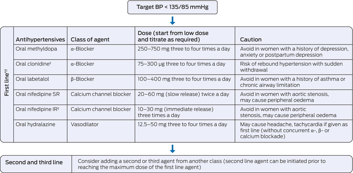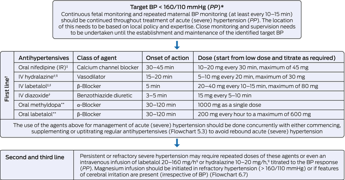 BP = blood pressure; IV = intravenous; PP = practice point. * Target BP should be individualised particularly in the presence of features of fetal compromise. † The most important consideration in choice of antihypertensive agent is that the unit has access and familiarity with that agent. Agents should be uptitrated as indicated in the first line section in this Box, and if target BP is not reached, second and third line treatment options should be employed. ‡ Supply and access may be limited in Australia and New Zealand. § Administration of IV agents should be followed by a 10–20 mL normal saline IV flush to ensure systemic circulation of the administered agent. ¶ 250 mL IV fluid preloading (normal saline 0.9%) should be considered to minimise the risk of hypotension (PP). ** Slower onset of action (up to two hours). Use can be individualised based on clinical setting (ie, in the absence of short‐acting agents).