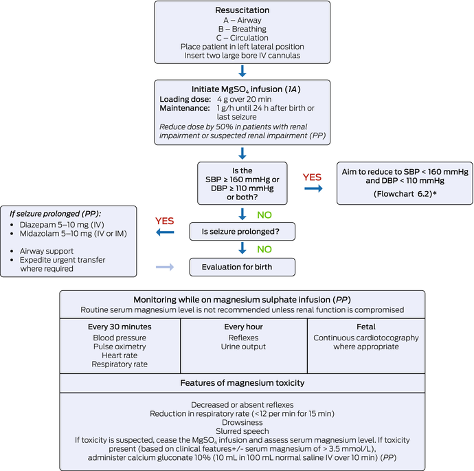 1A = based on 1A quality evidence; IM = intramuscular; IV = intravenous; MgSO4 = magnesium sulphate; PP = practice point. * This flow chart provides guidance based on the evidence at the time of which this guideline was developed. Management of eclampsia must be done in accordance with local protocol where applicable.11