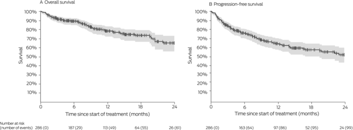 Secondary endpoints were overall survival, progression‐free survival, and toxicity.20 Tumour assessment intervals conformed with the usual standard of care. Overall survival was measured from commencement of ICI therapy to death from any cause, or censored at the final follow‐up assessment. Progression‐free survival was measured from commencement of ICI therapy to first documented evidence of disease progression or death from any cause. Data for people alive without evidence of progression were censored at the final follow‐up. Immunocompromised status was defined as the result of disease (ie, haematological malignancy), medication (systemic immunosuppressive treatment or prednisolone treatment exceeding 10 mg per day or equivalent for more than one month), or both.