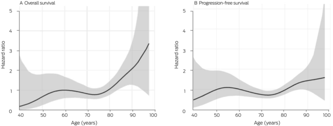 Baseline and treatment data are summarised as descriptive statistics. The influence of selected clinico‐pathological prognostic features identified in previous reports10,11,12,13,14,15 was assessed in a Cox proportional hazards model (age, gender, head and neck primary site, ECOG performance status, immunocompromised status, metastatic disease and prior nodal radiotherapy). Survival, using log‐log transformation (log‐hazard), is depicted in Kaplan–Meier curves with 95% confidence intervals (CIs). To test whether relationships of overall survival and progression‐free survival with age were non‐linear, penalised spline modelling was used in exploratory analyses. Given concerns about prescribing systemic therapies to older people because of potential toxicity, we undertook an exploratory analysis of the influence of ECOG performance and immunocompromised status on survival by age group (under 80 years, 80 years or older). The statistical significance of differences in age, immunocompromised status, and autoimmune disease for people who did or did not report immune‐related adverse events of grade 2 or higher was assessed in independent sample t and χ2 tests. All statistical analyses were performed in R 4.2.1 (R Foundation for Statistical Computing).