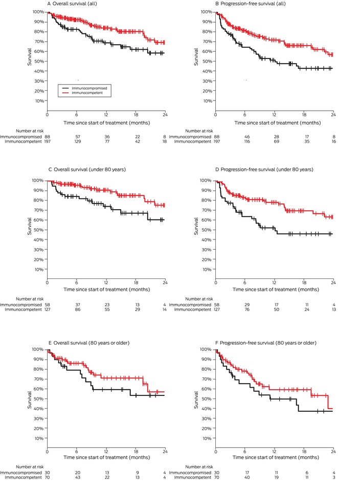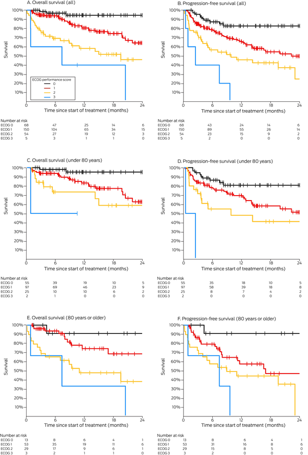 Our spline analysis indicated that the decline in overall and progression‐free survival was most marked from the age of 80 years (Box 5). The influence of ECOG performance status on survival was similar for people under 80 years of age and for those aged 80 years or more. Survival outcomes were best for people with ECOG performance scores of 0, and also clinically meaningful for those with ECOG scores of 1 or 2; survival was poor for the few patients with ECOG scores of 3 (Box 6). Kaplan–Meier analysis indicated that both overall and progression‐free survival were poorer for immunocompromised than immunocompetent patients in both age categories (Box 7).