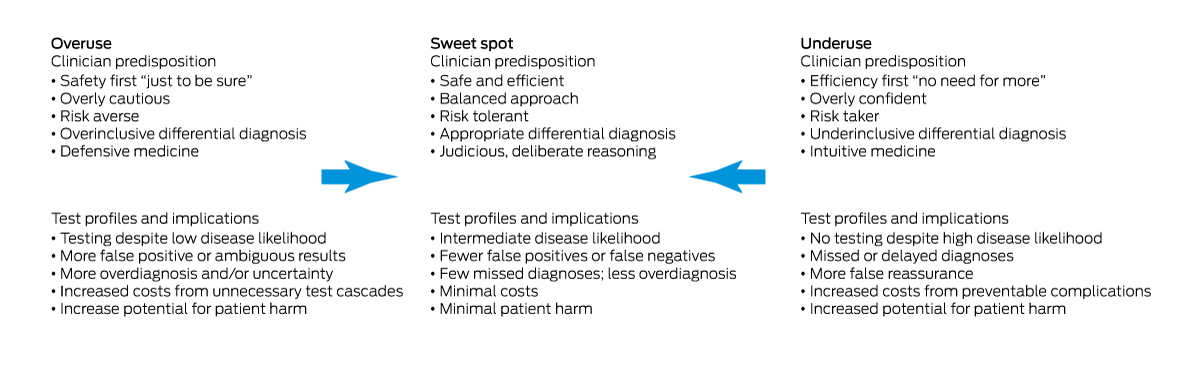 Increasing availability and use of a greater range of pathology and imaging investigations, medicolegal concerns arising from undertesting, few disincentives for overtesting, time pressures, patient expectations, and unawareness of new evidence all promote inappropriate test use.5 Innate risk tolerance, personality traits and cognitive biases of clinicians also influence test requesting behaviours.6 This perspective article describes the drivers of inappropriate use and proposes strategies for achieving the “sweet spot” in using diagnostic tests (Box 1).