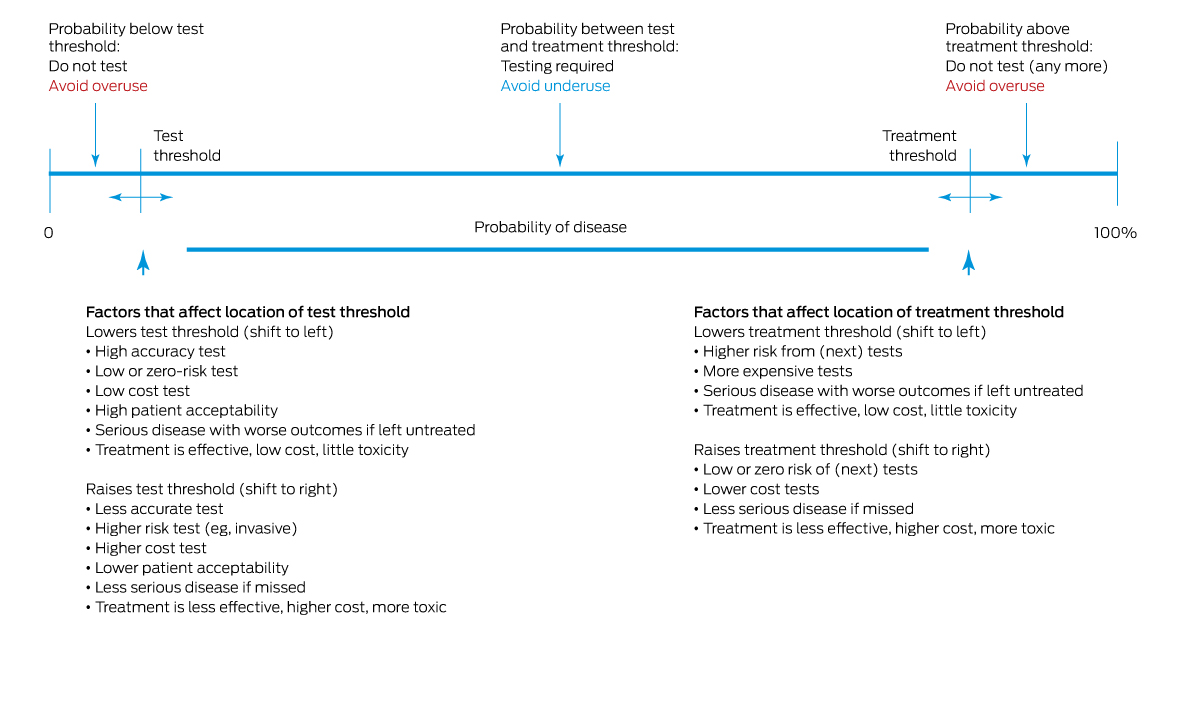 Test requests require consideration of pre‐test disease probability, test accuracy, and benefits and harms of downstream treatments, as well as the acuity and severity of the clinical condition. Tests may be inappropriate when disease probability is too low or too high for the test result to influence decision making. In particular, testing in individuals with very low disease probability will likely yield few true positive results, generate more false positives and do little to reassure patients or resolve their symptoms.14 Unfortunately, clinicians often overestimate pre‐test probability15 and do not adequately adjust down their estimates of post‐test disease probability according to test results, due to a misunderstanding of test sensitivity, specificity and predictive value.16 Misjudgements are even more likely when an unexpected test result challenges the practitioner's well founded clinical suspicion.17 Considering in advance how a test result will influence further management requires an understanding of where post‐test probabilities sit in regards to test or treatment decision thresholds (Box 2).18