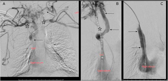Box 1 – (A) Central venography performed via bilateral upper limb contrast injection with the patient's arms by her side, showing bilateral brachiocephalic vein (BCV) obstruction (stars).* (B) Recanalised right BCV containing undeployed covered stent (star).† (C) Central venogram after covered stent deployment (arrows) in the right BCV showing rapid inline flow to the right atrium and disappearance of venous collaterals (compare with panels A and B)