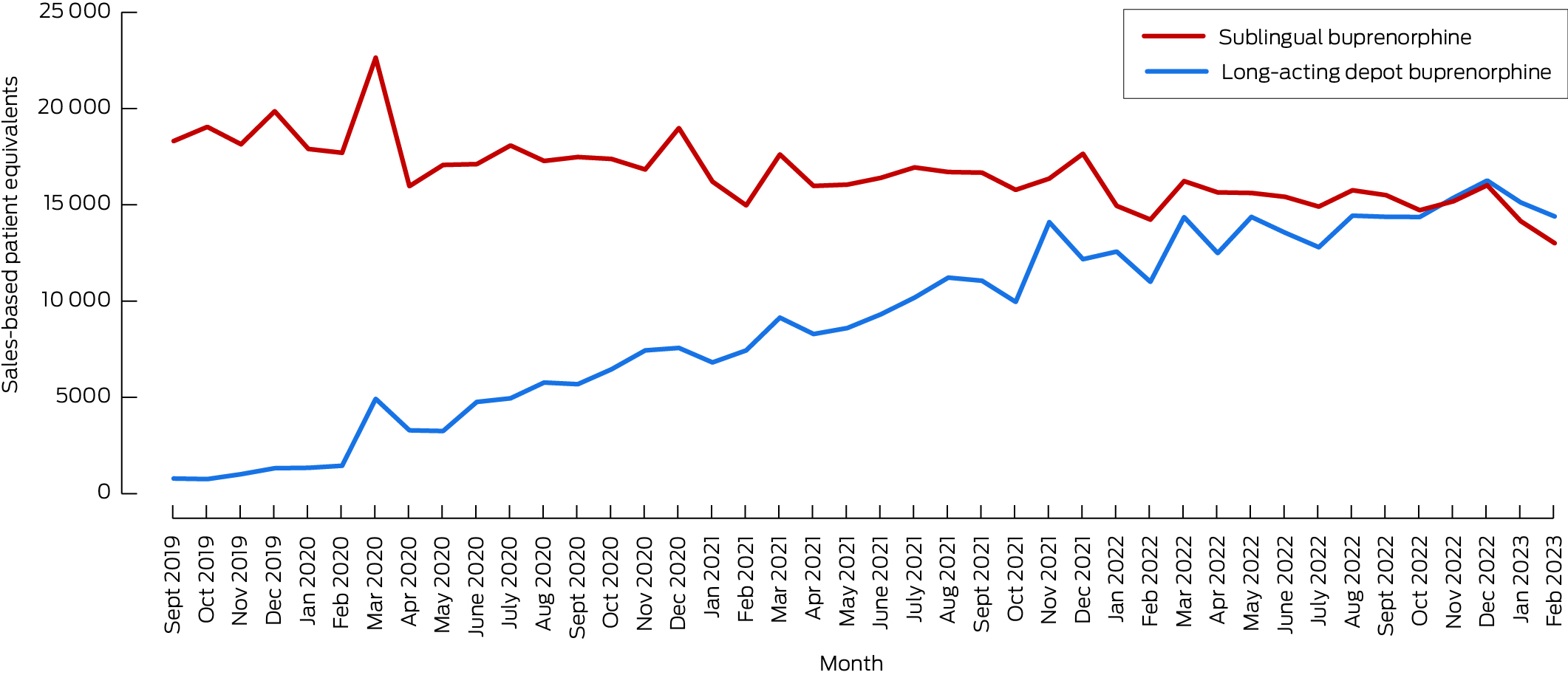 We therefore used opioid medication sales data to estimate the sales‐based patient equivalent (SPE) as a proxy measure of the maximum number of people treated with each buprenorphine formulation. The monthly SPE for sublingual buprenorphine was calculated by dividing the total amount (in milligrams) sold to pharmacies, clinics, hospitals, and prisons by the number of days in each month and the estimated mean daily sublingual buprenorphine dose (based on Australian studies: 14 mg).5 The monthly SPE for long‐acting depot buprenorphine was estimated as the number of monthly injections (each corresponding to one person) and the number of weekly doses sold divided by four. Buprenorphine sales data for 1 September 2019 – 28 February 2023 were provided by the pharmaceutical companies (sublingual buprenorphine: Invidior; depot buprenorphine: Camurus, Invidior). We did not seek formal ethics approval for our analysis of population‐level data that did not allow identification of individual persons.
