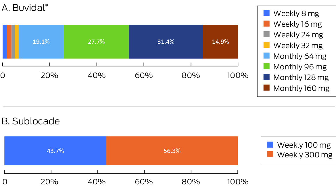 Opioid agonists, such as methadone and buprenorphine, are effective for treating opioid dependence. In 2022, more than 55 000 Australians were receiving opioid agonist treatment on any day.1 As alternatives to sublingual buprenorphine and buprenorphine–naloxone formulations, two long‐acting depot buprenorphine products, requiring subcutaneous injection once a week or month, were listed by the Pharmaceutical Benefits Scheme (PBS) for subsidised dispensing in October 2019 (Buvidal; Camurus AB2,3) and May 2020 (Sublocade; Indivior4).