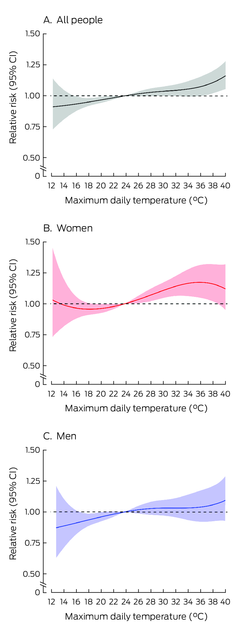 Daily maximum temperatures during 2015–2019 ranged between 12.2 and 45.0°C; 209 mental health presentations (4.7%) were on days with maximum temperatures at or above the 95th percentile (35.2°C). Compared with the median maximum temperature of 23.8°C, the risk of presentation (men and women combined) increased beyond 36°C, but was not statistically significant at either the 80th (29.2°C; RR, 1.03; 95% CI, 0.999–1.07) or 95th temperature percentiles (35.2°C; RR, 1.07; 95% CI, 0.996–1.14). For women, the risk of presentation increased steadily for temperatures between 28°C and 38°C, and was statistically significant at the 80th (RR, 1.09; 95% CI, 1.04–1.15) and 95th percentiles (RR, 1.17; 95% CI, 1.06–1.30). This risk corresponds to 215 (95% CI, 61–352) attributable presentations at the 80th percentile and 54 (95% CI, 1–98) at the 95th percentile across the study period. The risk was not statistically significant for men at either percentile (80th: RR, 1.03; 95% CI, 0.97–1.10; 95th: RR, 1.10; 95% CI, 0.97–1.25) (Box). Differences by age or ICD‐10 diagnosis category were not evident, nor lag‐specific effects (data not shown).