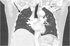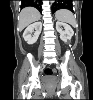 Box 1 – Computed tomography scan (coronal plane) showing thickened perirenal infiltrates around the kidney (arrow)