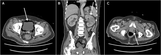 He returned to hospital six weeks after discharge from the Australian hospital, after being found unresponsive at home, with a preceding two‐week history of lethargy, fatigue, and anorexia. He was in septic shock with a temperature of 39°C, tachycardia, tachypnoea, and a Glasgow Coma Scale score of 10. CT scan revealed severe emphysematous cystitis (Box 2, A), left‐sided pyelonephritis (Box 2, B), prostatic abscess (Box 2, C), and gas within the lower pelvis. Operative source control with complete urinary exenteration was deemed not survivable. He was admitted to the intensive care unit, catheterised, and treated with IV meropenem, vancomycin and clindamycin. The infectious diseases team reviewed him within 24 hours of his admission, identifying his epidemiological risk factors for hypervirulent K. pneumoniae. Urine and blood cultures grew K. pneumoniae noted to have a hypermucoviscous phenotype (positive string test), following which his antibiotic regimen was rationalised to high dose IV ceftriaxone monotherapy. After initial clinical improvements, his condition deteriorated with new fevers, worsening confusion, and rising inflammatory markers and lactate on his blood tests, and IV metronidazole and ciprofloxacin were added. He gradually improved, receiving a further six weeks of oral ciprofloxacin monotherapy.