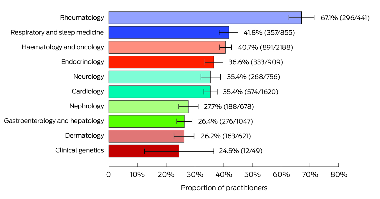 Box 2 – Proportions of doctors (with 95% confidence intervals) who received payments from Medicines Australia member companies, 1 November 2019 to 31 October 2022, for the ten specialties with the largest proportions*