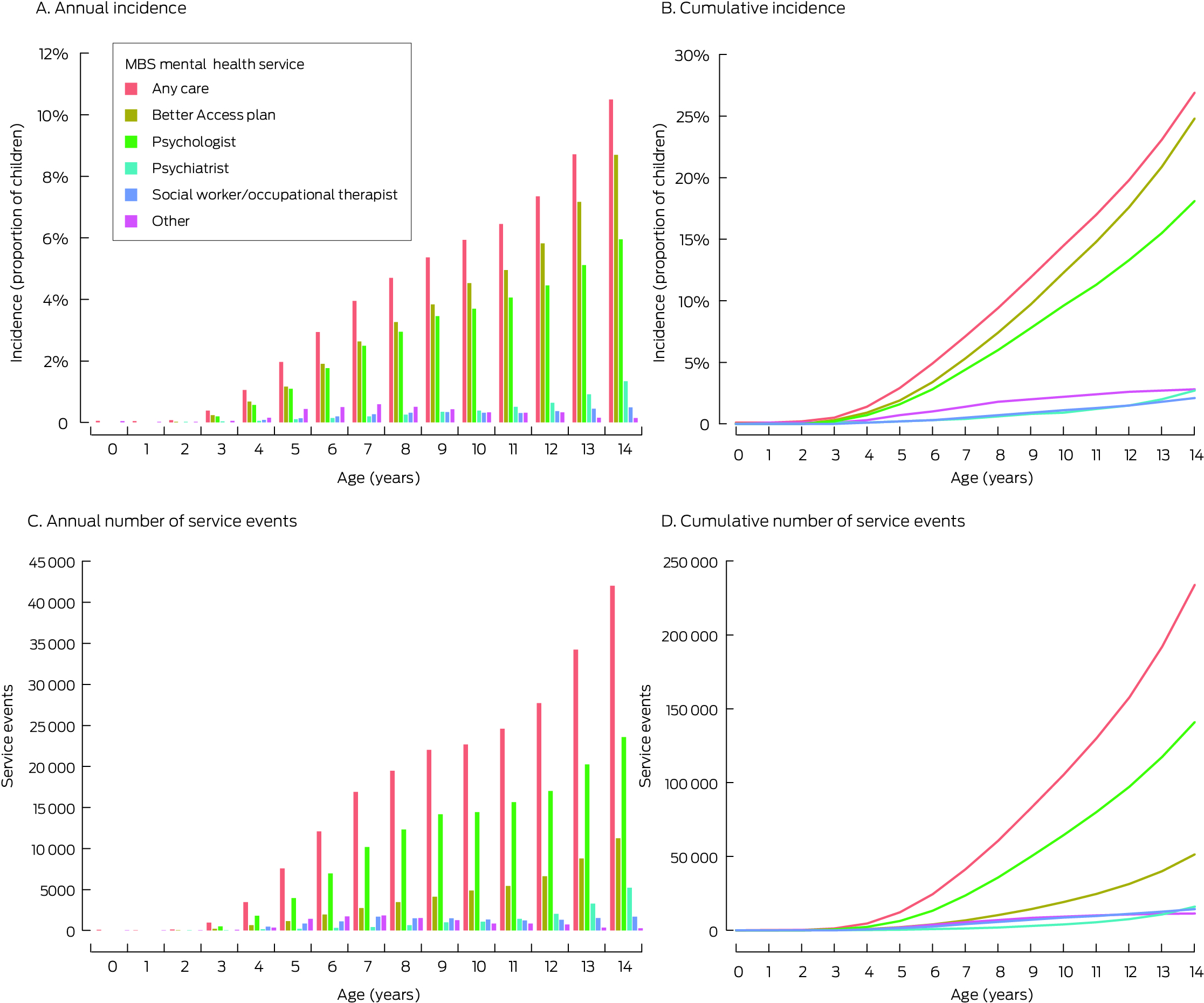 Box 2 – Annual and cumulative incidence and numbers of service events for 86 759 New South Wales children who received Medicare Benefits Schedule (MBS)‐subsidised mental health care before their 15th birthday, 2002–18, by service type*