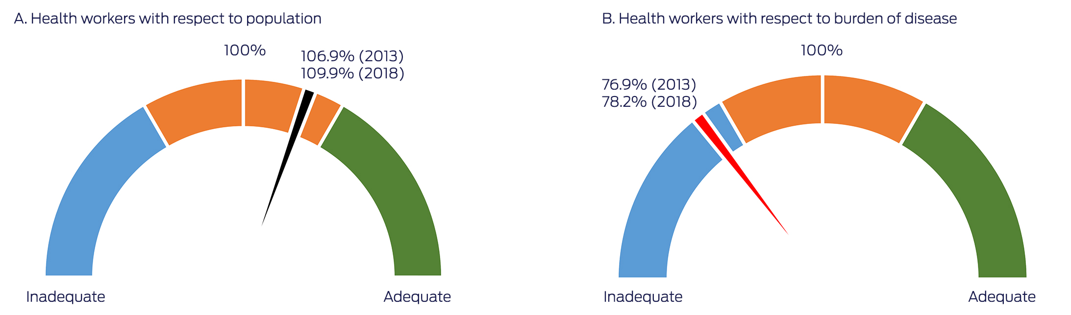 Our analysis indicates that the size of the NT health workforce, relative to its population size, was about 10% larger than the Australian health workforce during 2009–2018 (Box 1). This finding was consistent with those of a recent AIHW report4 and our earlier study18 that the number of health workers per NT resident is higher than for Australia. However, another AIHW report noted a severe shortage of health workers in rural and remote areas of Australia, including in the NT.19 Geographic maldistribution of the health workforce results in widespread mismatching of health services with health needs in remote and very remote areas, but population‐based assessments at the state or territory level do not detect local pockets of mismatch.19