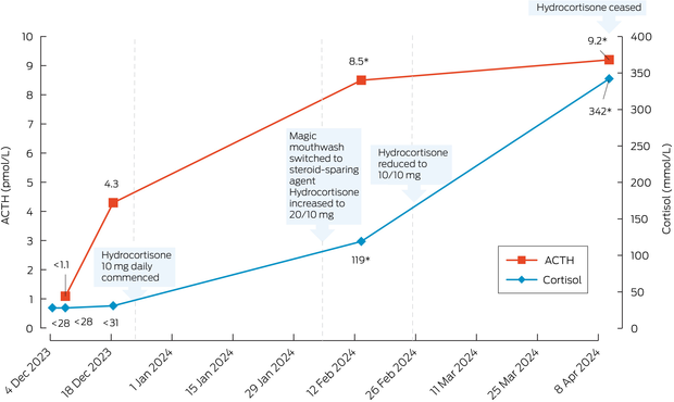 A follow‐up evaluation two months after stopping the magic mouthwash demonstrated recovery of the hypothalamic–pituitary–adrenal (HPA) axis, with morning cortisol 342 nmol/L and paired ACTH 9.2 pmol/L. The patient was advised to stop the hydrocortisone 10 mg twice daily, and an SST performed ten days later confirmed an excellent response with peak cortisol 599 nmol/L at 60 minutes. Oral lichen planus remained well managed throughout. Biochemistry trends are shown in Box 2.