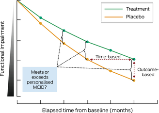 Treatment (green line) demonstrates slower disease progression compared with placebo (orange line) over time from starting the treatment/placebo (baseline). Functional assessments, as measured at various time points by outcome tools such as Clinical Dementia Rating and Integrated Alzheimer Disease Rating Scale, allow for time‐based (horizontal double arrow) and outcome‐based (vertical double arrow) perspectives. Determining when a personalised minimal clinically important difference (MCID) for an individual is met or exceeded is possible with the use of outcome tool metrics combined with a graphical representation of disease progression.