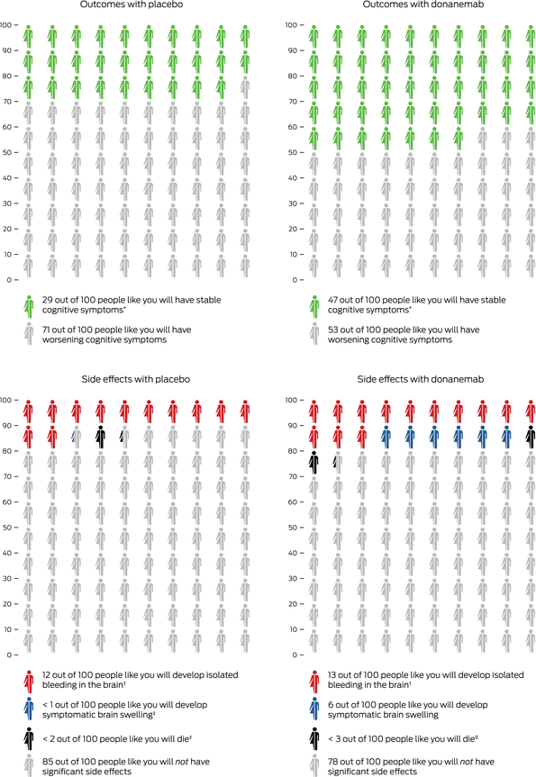 Icon array representation of TRAILBLAZER‐ALZ 2 trial3 for donanemab (low/medium tau group). Numbers indicate how many people will experience a given outcome when treated with placebo or donanemab over a 12‐month period for outcome (top graphs) or an 18‐month period for side effects (bottom graphs). * Outcome based on unchanged Clinical Dementia Rating Sum of Boxes score at 12 months, compared with baseline. † Value based on combined tau group data. ‡ The value of “< 1” is equal to 0.2. § “< 2” is equal to 1.3. ¶ “< 3” is equal to 2.1.