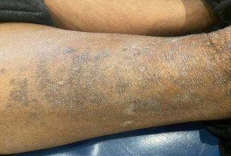 A 65‐year‐old man was referred to a private dermatologist for diagnosis and management of a hyperkeratotic, scaly, pruritic eruption affecting the trunk and extremities, which had been worsening over 12 months. Moderate potency topical corticosteroids had failed to improve his condition. He reported a history of previously treated pulmonary tuberculosis, prior venous thromboembolism, and asthma–chronic obstructive pulmonary disease overlap syndrome. He denied using regular prescription or over‐the‐counter medications. He migrated to Australia from South America in 1969 and resides with his partner, who prepares his meals. After becoming unemployed 12 months ago, he struggled with persistent low mood and poor appetite. He smoked marijuana and denied significant alcohol consumption.