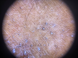 Box 2 – Hyperkeratotic papules with prominent keratin plugging and white perifollicular scale absent of erythema, and prominent skin markings (10 × magnification)