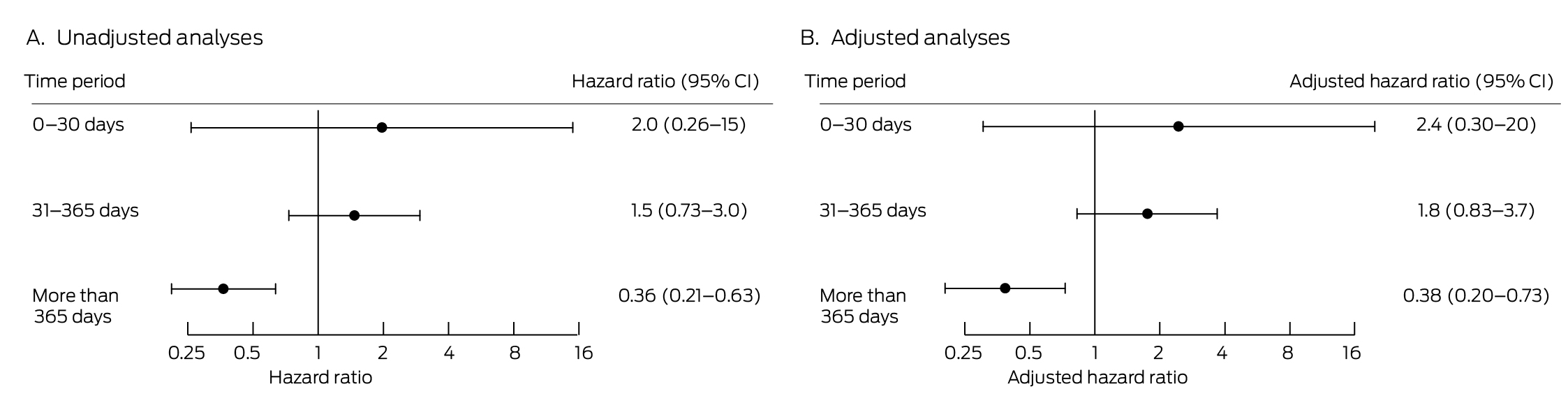 Survival was assessed in piecewise Cox regression models in which transplantation was a time‐varying exposure. The risk of death initially increases after transplantation because of surgery‐related risks and early intense immunosuppression, but declines in the longer term.3 As the risk is highest during the first month and remains elevated for about twelve months, treating transplantation as a time‐varying covariate led to violation of the proportional hazards assumption. We therefore divided post‐transplantation follow‐up into clinically relevant periods, allowing us to account for this violation: less than or equal to 30 days, 31–365 days, and longer than 365 days.