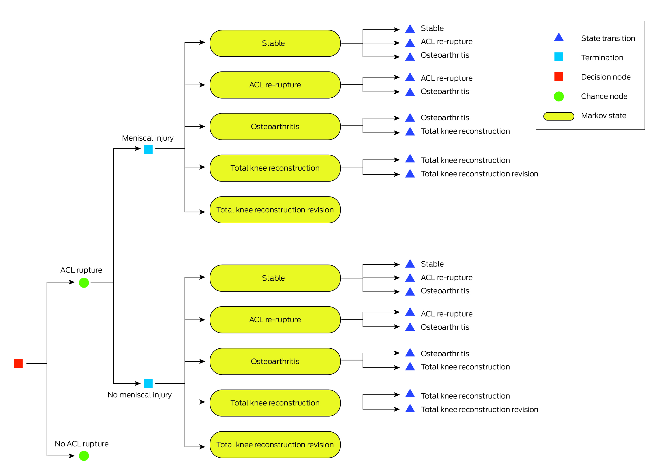 We conducted a Markov decision analysis, in Excel for Mac 2011 (Microsoft), of the costs and benefits of a national ACL injury prevention program for football (soccer) players in Australia. Markov models are often used in public health research to evaluate events with ongoing risks, which have consequences, and which occur more than once, such as ACL ruptures.13 Taking a societal perspective, we used a 35‐year Markov model with yearly cycles discounted by 5%. Footballers either remain in one health state or transition to another health state (eg, ACL rupture to ACL re‐rupture to osteoarthritis to total knee replacement to total knee replacement revision), with different probabilities and costs applied according to whether the ACL rupture was accompanied by meniscal injury (Box 1). Separate models were used for different age groups (10–17, 18–34, 35 years or older) and gender. Our Markov model design was based on that of an earlier British study.9 We report our analysis according to the consolidated health economic evaluation reporting standards (CHEERS) checklist.14