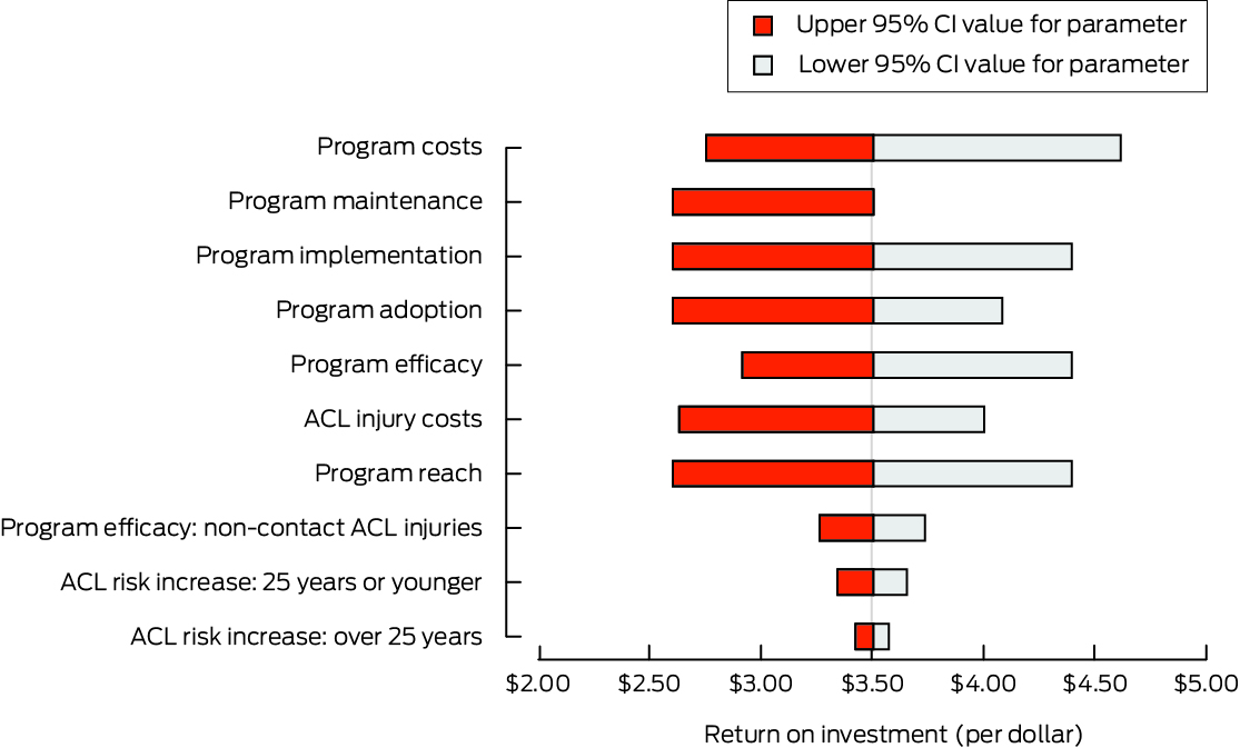 We report the first economic modelling of the cost savings that could be achieved by a national ACL injury prevention program for amateur footballers in Australia. Our findings suggest that such a program could lead to substantial cost savings; as each dollar invested would yield a return of $3.51, the program could be considered a sound financial investment. The robustness of our main findings were confirmed in sensitivity analyses, indicating that the primary prevention of ACL injuries can be economically justified. As the injury prevention program was found to be a dominant strategy (concurrent health benefits and cost savings), incremental cost‐effectiveness ratios were not reported (these are reported when benefits are accompanied by increased costs).32 A New Zealand study found that the return on investment for a national football injury prevention program was NZ$2.41 per dollar, and even higher for rugby union (NZ$7.18) and netball (NZ$12.64).33 National programs should be favoured over local programs; a systematic review of national public health interventions found that they generally achieve a greater return on investment.8 Our model also indicated the importance of optimising program adoption and implementation; increasing either factor by 15% achieved a higher return on investment than with their baseline values (program adoption, $4.56 per dollar; program implementation, $5.29 per dollar). This finding implies, from a cost‐effectiveness perspective, that effective ACL injury prevention programs should be scaled up and widely implemented.19