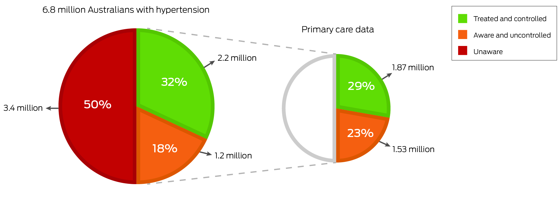 Background. Raised blood pressure is the leading preventable cause of death in Australia. One in three Australian adults (6.8 million people) have hypertension, defined as clinic or office blood pressure greater than or equal to 140/90 mmHg, based on randomised population data.10 Screening campaigns found that about half of these adults (3.4 million) have not had their high blood pressure values detected and are unaware of their hypertension,11 hence are not receiving appropriate treatment. Of those who are diagnosed with hypertension, and treated in the general population, only 32% (2.2 million) are treated effectively, that is, reducing their blood pressure to less than 140/90 mmHg (Box 1).10,11 Australians who visit primary care centres have somewhat different rates, where 55% of patients are treated and have their blood pressure effectively controlled.12