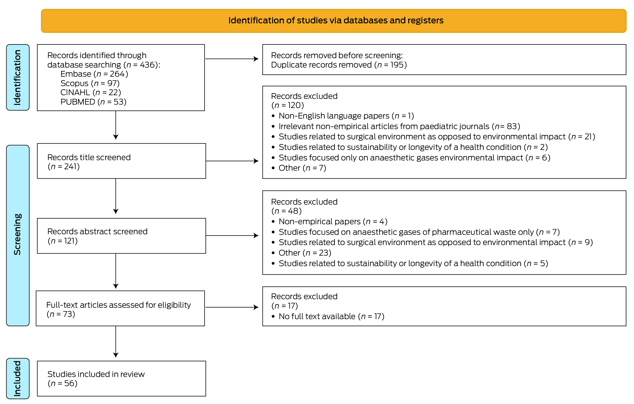 A literature search was conducted in early 2023 by one author (LP) using Embase, Scopus, PUBMED and CINAHL databases to identify articles on operating room waste management. These databases were chosen because they provide access to a breadth of research across the medical and social sciences. The final keywords used for the search were: surgery, waste and plastic. Further details of the search strategy are provided in the Supporting Information. Authors TK and KW reviewed the search results and screening decisions. In the initial search, 436 articles were identified, with that reduced to 56 once the inclusion and exclusion criteria were applied. The Box shows how studies were screened and selected for this narrative review, using the PRISMA (Preferred Reporting Items for Systematic Reviews and Meta‐Analyses) method.